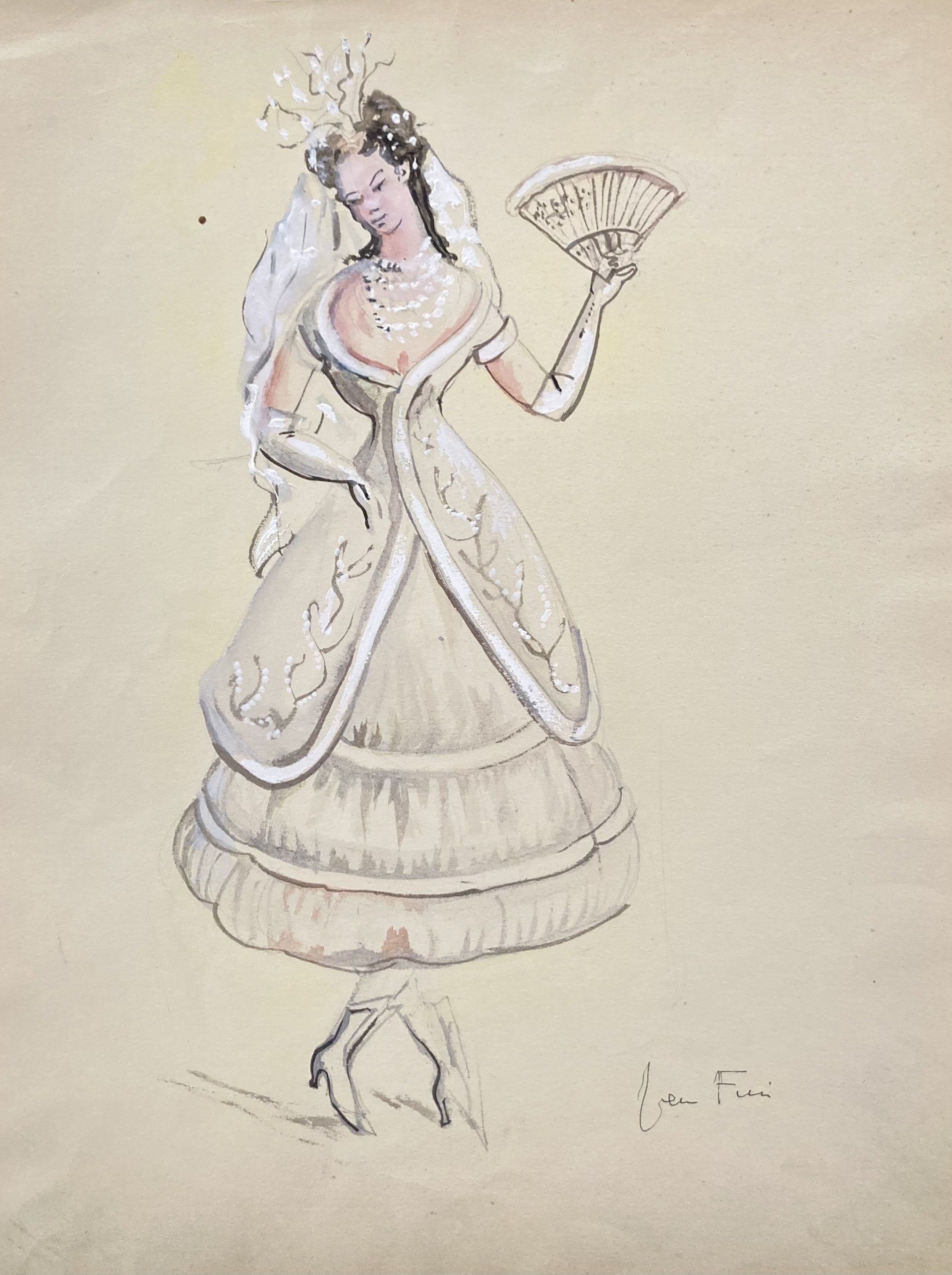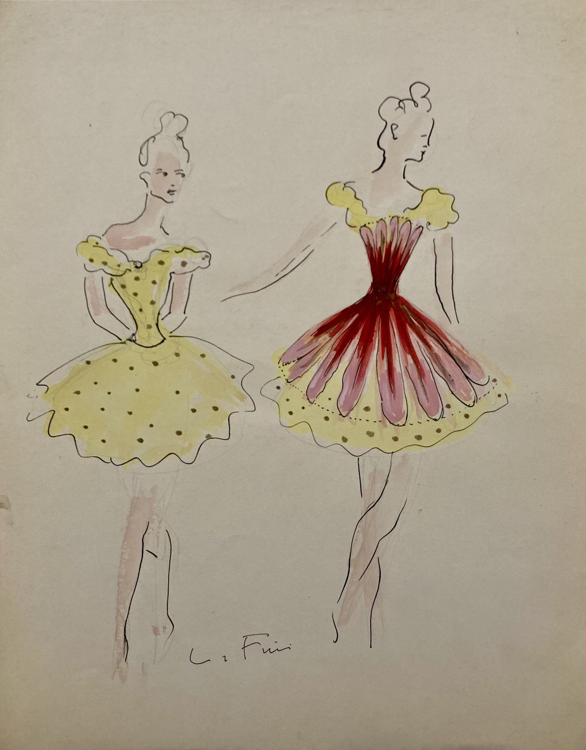 Son imagination fantasque, sa prédilection pour la fête et le théâtre incitent Leonor Fini, dès l’après-guerre, à répondre à de nombreuses commandes de décors et costumes pour la scène. Masques et déguisements pour les bals costumés consacrent son rôle d’égérie secrète et extravagante de fêtes somptueuses. Dans la période 1945-1960, elle travaille, entre autres, pour l’Opéra Garnier à Paris et la Scala à Milan. On y retrouve des noms familiers de la scène parisienne et italienne : l’actrice Anna Magnani, grande amie de Leonor ; Oscar Wilde avec ses pièces adaptées par Jean Anouilh; des films de John Huston et Jean Renoir; des costumes pour les divas Maria Callas et Régine Crespin, ou les danseuses du Palais de Cristal de Balanchine… et bien d'autres ! Ces dessins proviennent directement de la succession de l'artiste.
